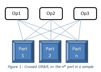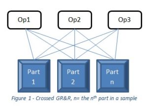 3DES typically uses the Crossed GR&R ANOVA method. This method measures the same parts, multiple times, by multiple operators (see fig1). This is typically done with part ordering being random for each operator or sometimes having both operator and part order being randomly selected.