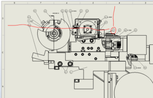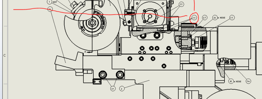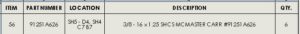 The third column is location. This provides the reader to the exact location of the component in the print. Some will have a tendency to leave this information out. However, having this in place makes the drawing much more readable and useful in finding exactly where the components are located. In the example provided in Figure 1, Item 56 is said to have at least one of the parts on sheet 5 in area D4. Using sheet 5 (SH5), shown in Figure 2, we can locate the part. Starting in zone D (shown as letters in the left hand side of the drawing) then going across the page to zone 4 (shown as numbers at the top of a drawing) a balloon callout showing Item 56 can be found.